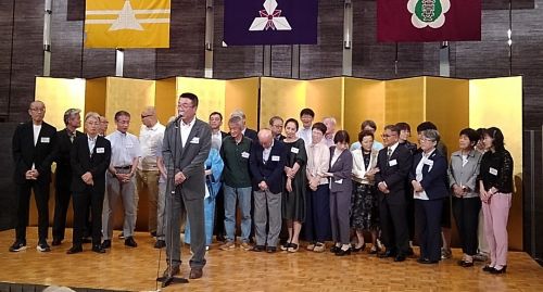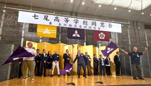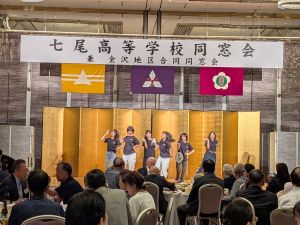 高27期生に期別最多参加賞が贈られました 七尾高校ダンス部によるダンス披露 役員のご紹介 同窓会 顧問 佐原吉博氏(高7) 顧問 津田文雄氏(高20)より 中締めのご挨拶 平常歌、校歌斉唱 今年も金沢地区合同同窓会と共に七尾高校同窓会が開催されました。 開宴冒頭、能登半島地震により犠牲となられた方々、今までに亡くなられた同窓生の方々へ、盛本芳久氏(高25)による尺八の音色に思いをはせご冥福をお祈りし黙祷を捧げました。 県内外をはじめお越しいただきましたご来賓の方々のご紹介、久保同窓会会長より日頃から同窓生皆様のご尽力とご協力への感謝を述べられ、樋上校長より生徒たちの活躍などのご報告がありました。 そして、金沢地区合同同窓会会長 小石芳一様(高32)の乾杯のご発声にて開宴となりました。 本日、ダンスを披露し会場を盛り上げてくれた本校ダンス部の生徒たちは、今年5月に大阪・関西万博のステージに立ち、胸を張って楽しく踊る姿が頼もしくもあり素敵でした。 会の後半は、期別最多参加賞を受賞した高27期に記念品が贈られ、なんと前年に受賞した高25期生からもプレゼントが手渡されました。そして久保会長再任に伴い役員の紹介、参加者最高年齢となった佐原吉博氏(高7・顧問)のご挨拶、津田文雄氏(高20・顧問)から中締めのご挨拶をいただき、盛会のうちに幕を閉じることができました。心より感謝を申し上げます。ありがとうございました。